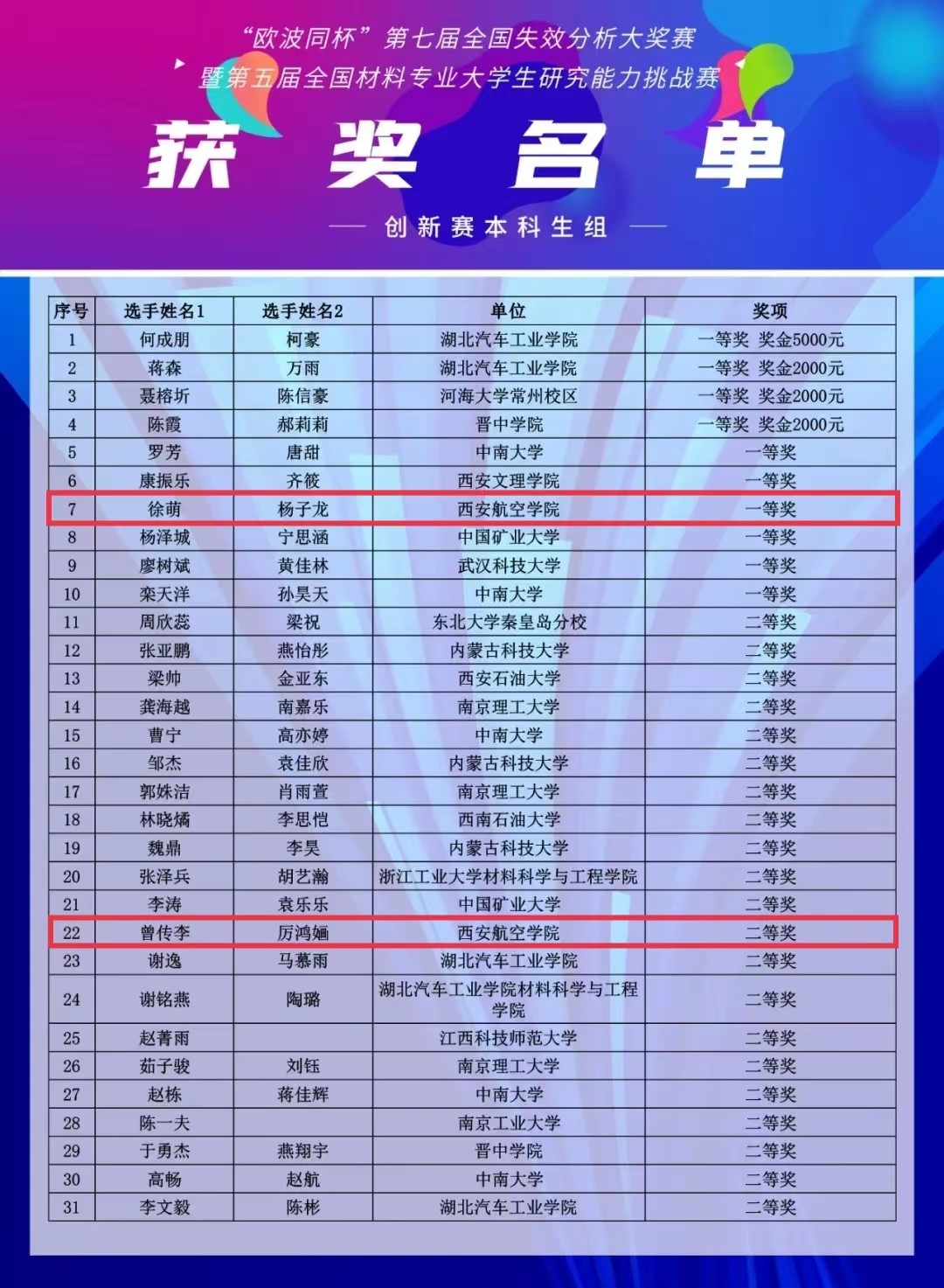 公司参赛选手围绕工程实践出现的材料失效难题,在老师的指导下开展了大量研究性实验,阐明了材料失效机制并提出解决方案。最终,在创新赛组中,唐健江老师和张海鸿老师指导徐萌同学、杨子龙同学获得了本科生组一等奖,邓新科老师和张龙老师指导的曾传李同学、厉鸿婳同学获得了本科生组二等奖。