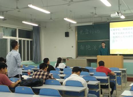 活动二:9月17日晚,组织大二各班以班级为单位召开“光盘行动”主题班会。班会上让同学们观看我们身边的“盛宴”的图片以及为同学们讲解为什么要光盘、如何光盘。会后同学们依次分享了自己对光盘行动的感受以及自己今后该如何用行动来实践光盘行动的心得体会。