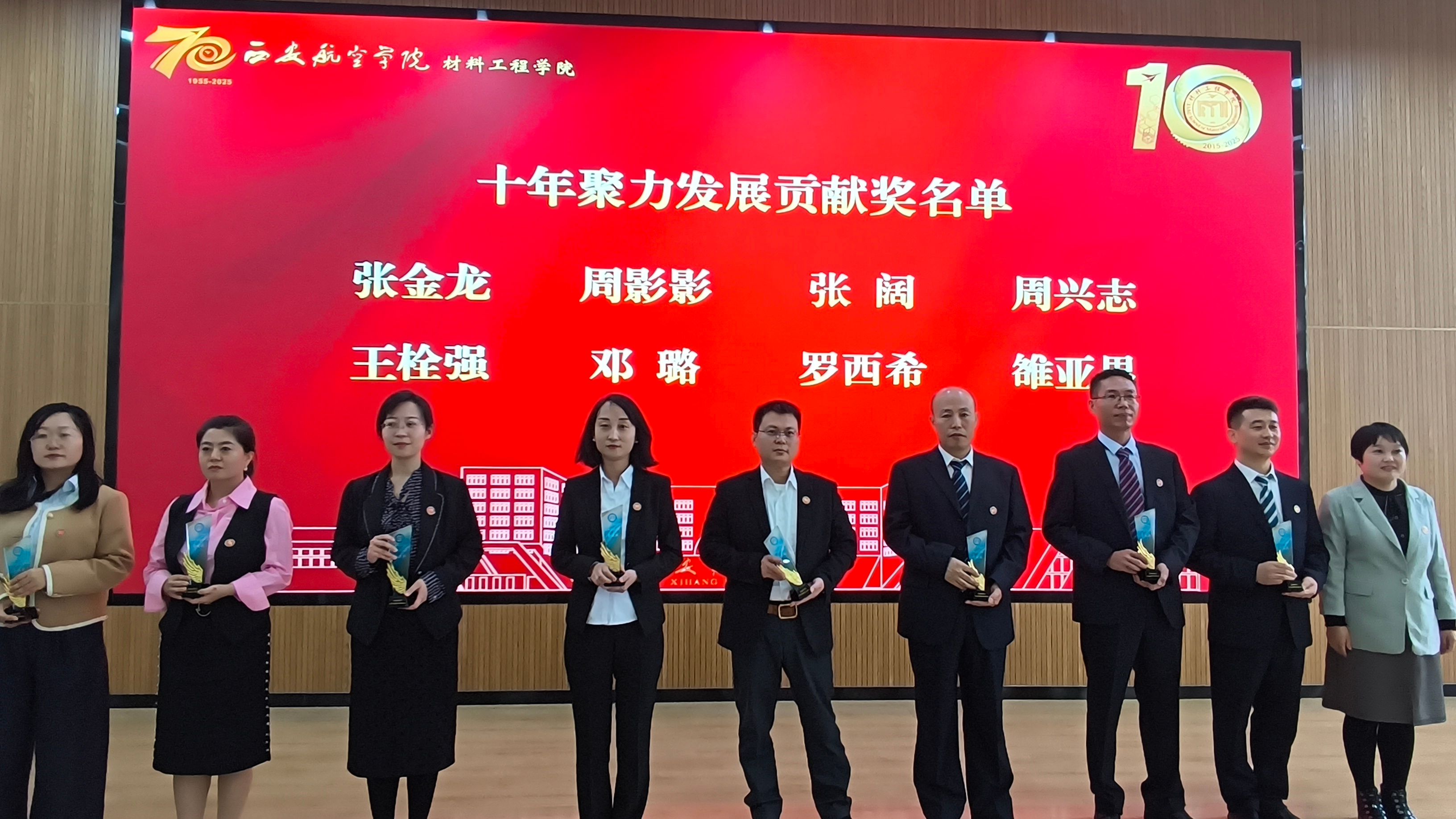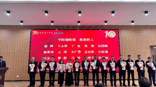 经理于方丽教授在致辞中回顾了公司十年不平凡的发展历程,向所有为公司建设付出心血的前辈、师生和各界朋友致以衷心感谢。大会特别设置了“致敬奉献”环节,员工代表向谢辉、曹静等14位建院第一批教师代表敬献鲜花,表达了深深的感恩与崇高的敬意。随后,大会对宋梦华、张金龙等16名十年来在教学、科研、管理服务一线做出突出贡献的在职教职工进行了隆重表彰,树立了爱岗敬业的榜样。建院元老曹静老师与公司首届本科毕业生、现已留校任教的杨超群老师,携手两位大一新生共同献词,象征着育人薪火代代相传,生动诠释了“立德树人”的根本使命。