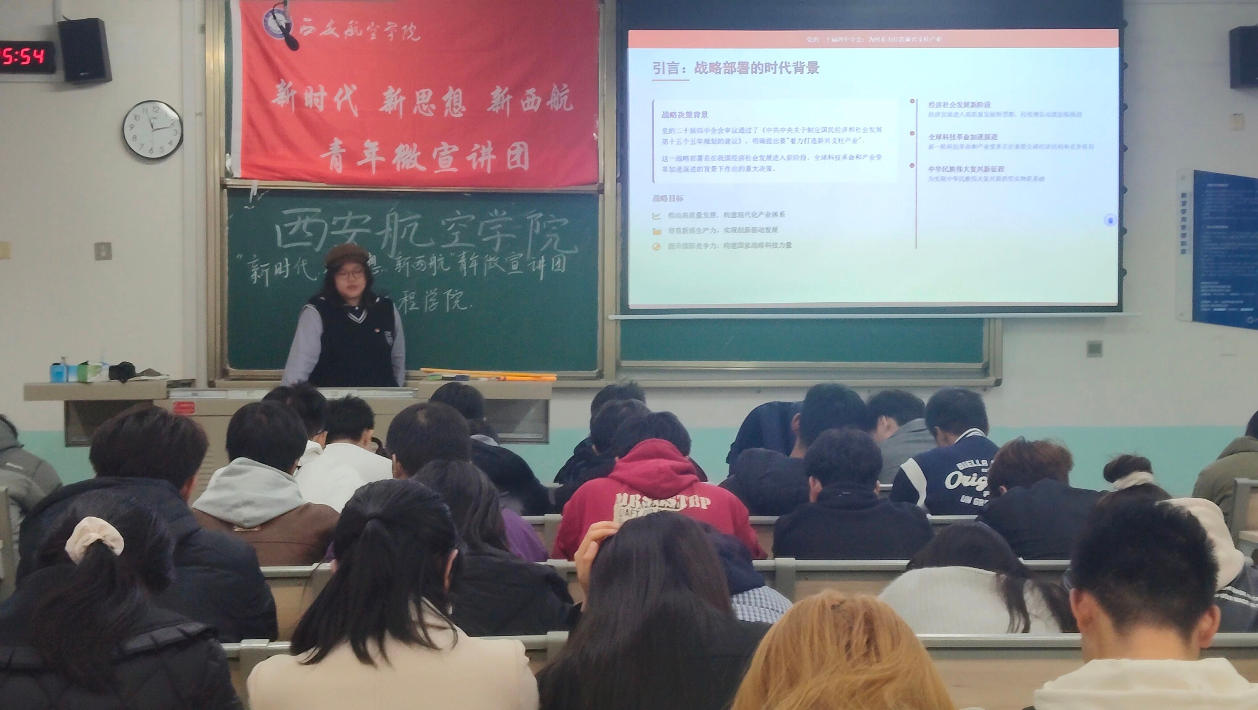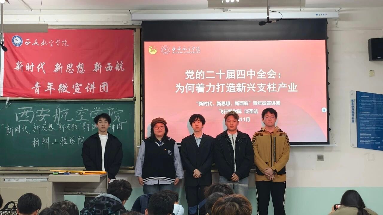 宣讲团成员淡圣洁以“党的二十届四中全会:为何着力打造新兴支柱产业”为题,从国家发展战略、产业升级需求、青年责任等维度,阐述了打造新兴支柱产业对于经济高质量发展、科技自立自强的重要性,尤其聚焦航空产业在新兴支柱产业中的定位与潜力,引导同学理解产业发展与专业学习的关联。