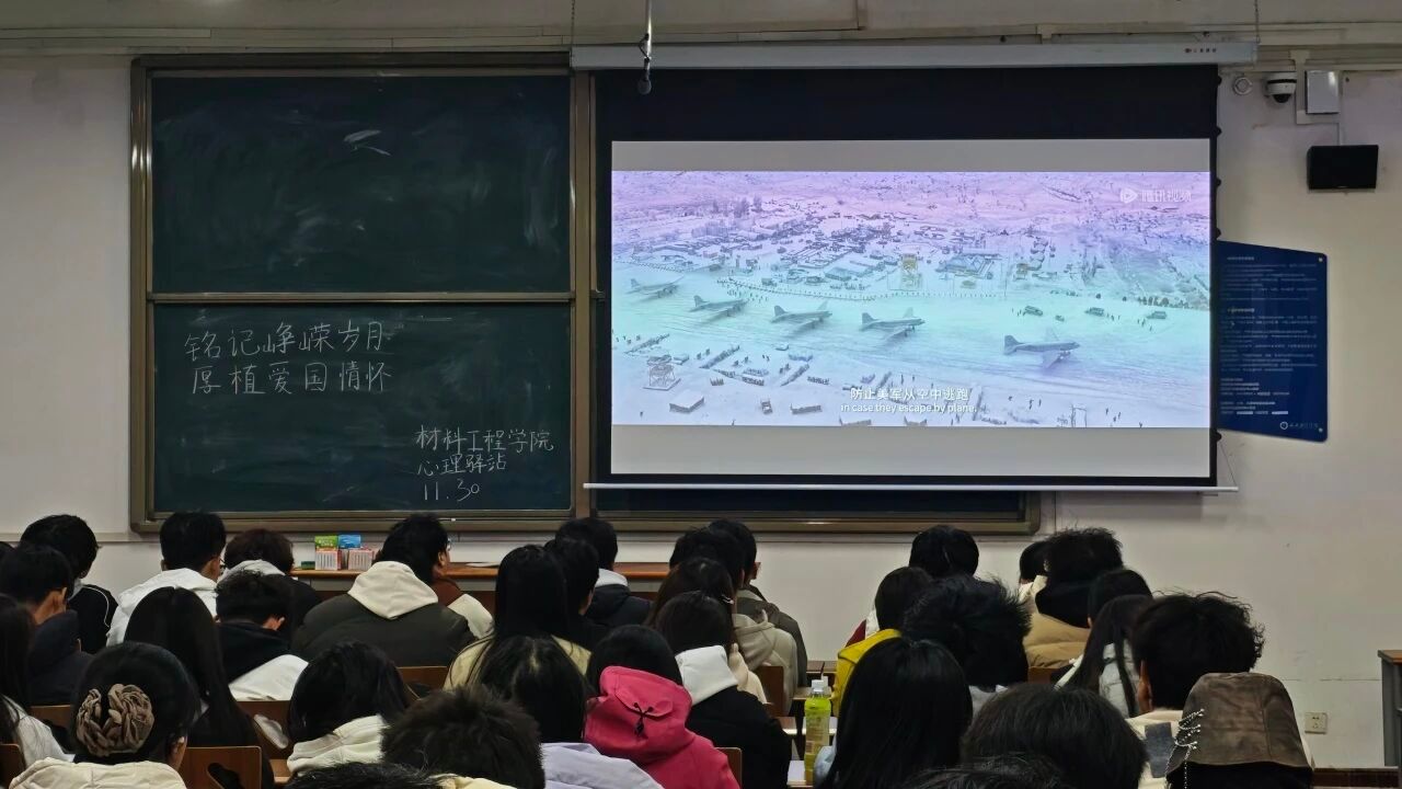 在活动过程中,心理驿站组织观看了爱国经典影片《长津湖之水门桥》,通过震撼的战争场面、鲜活的英雄形象,直观呈现抗美援朝战争中志愿军战士在极寒环境下浴血奋战、保家卫国的壮阔历程。